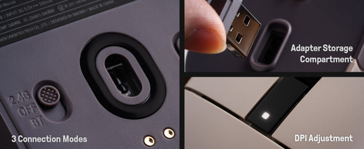 3 modos de conexión / Compartimento para el adaptador / Botón de Ajuste de DPI