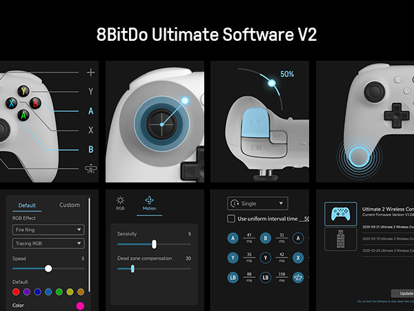 Utiliza el software de configuración de 8BitDo para personalizar los parametros de sensibilidad, luces RGB, remapeo de botones, macros, y mucho más.